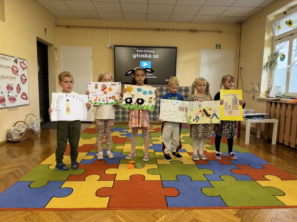 Częścią główną naszego konkursu była recytacja wierszyków zawierające głoski syczące i szumiące. Do wierszyka dzieci wykonały piękne prace plastyczne, które zaprezentowały na forum.