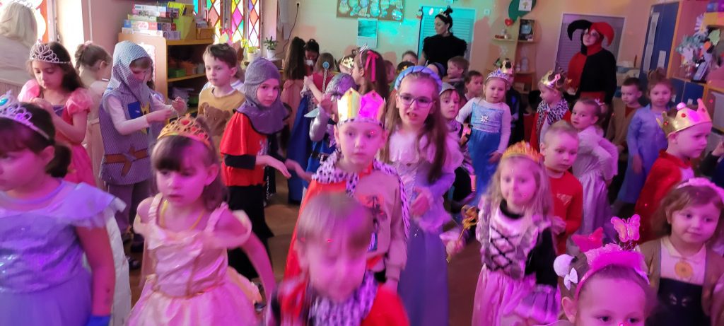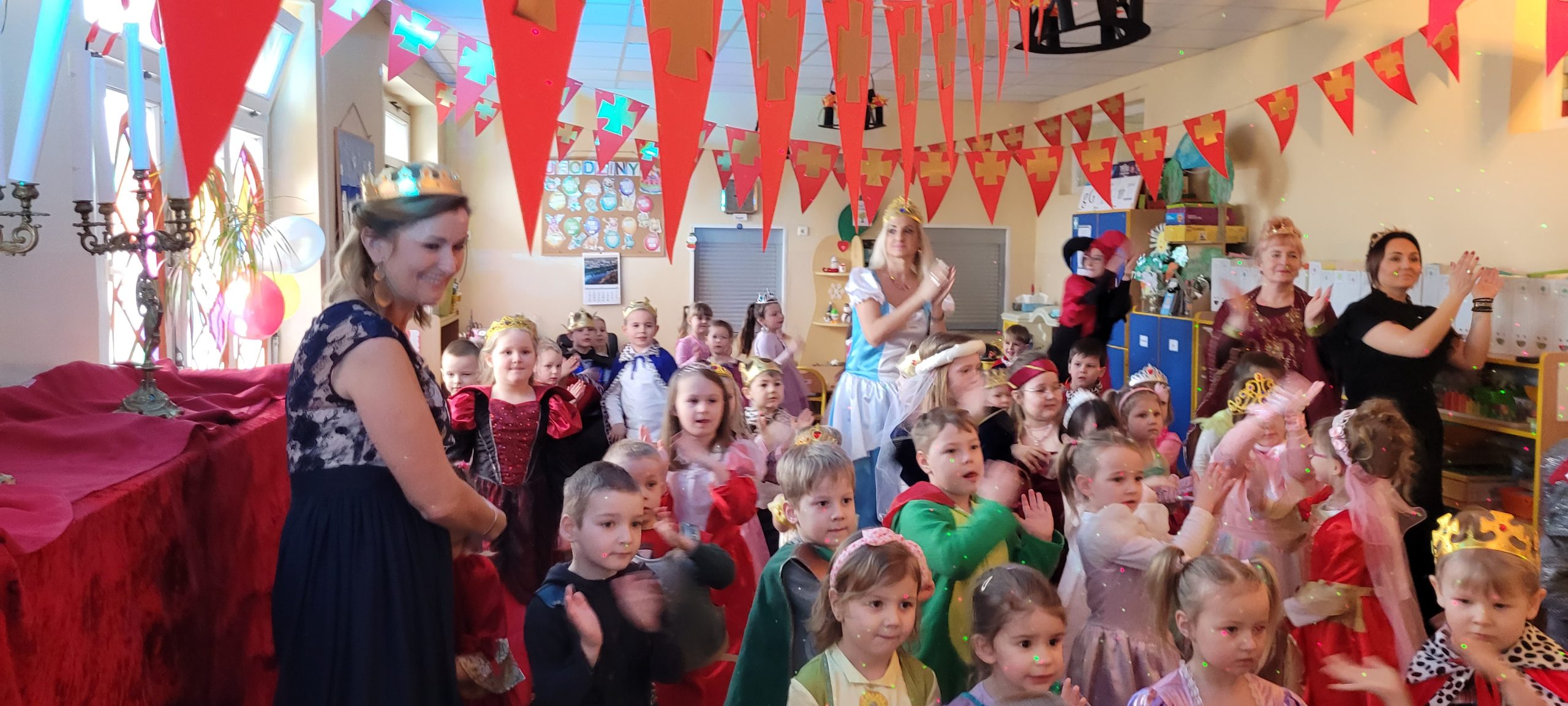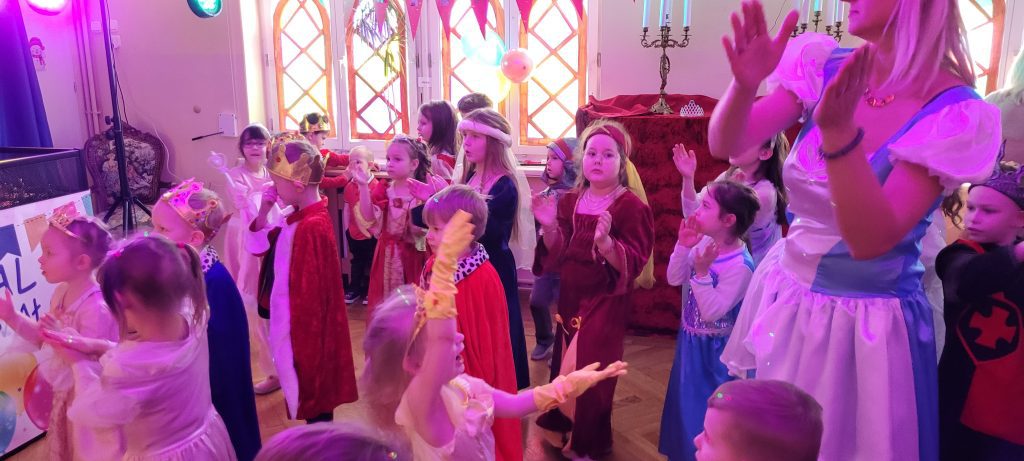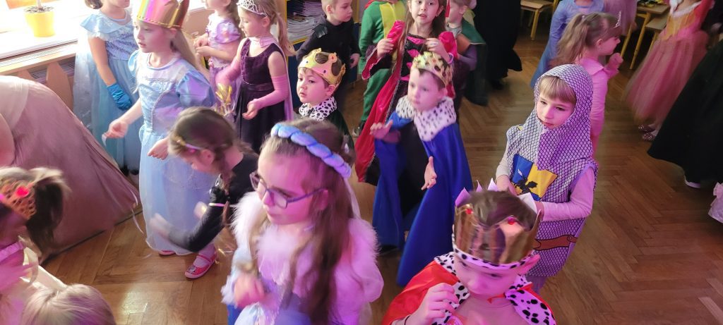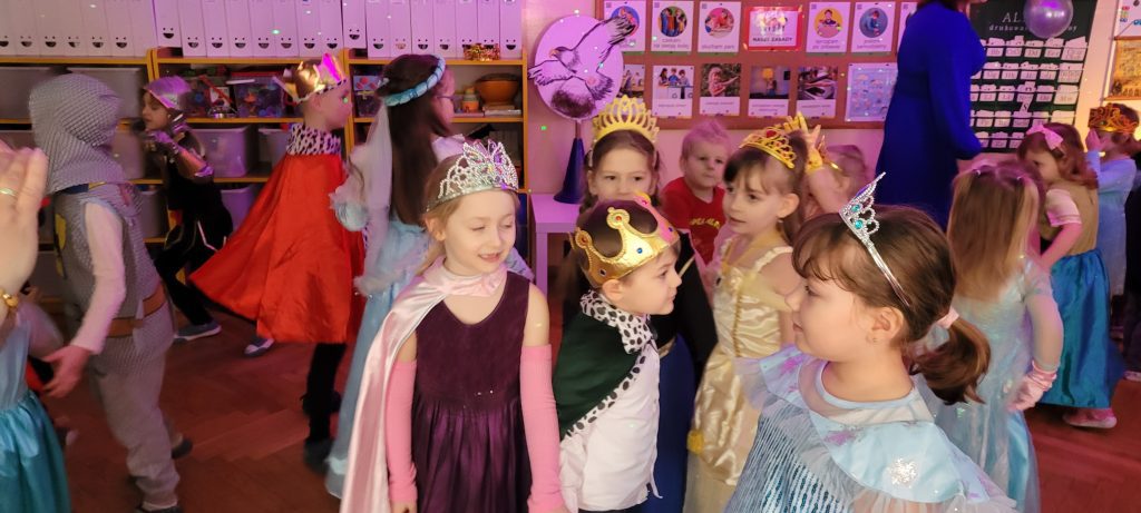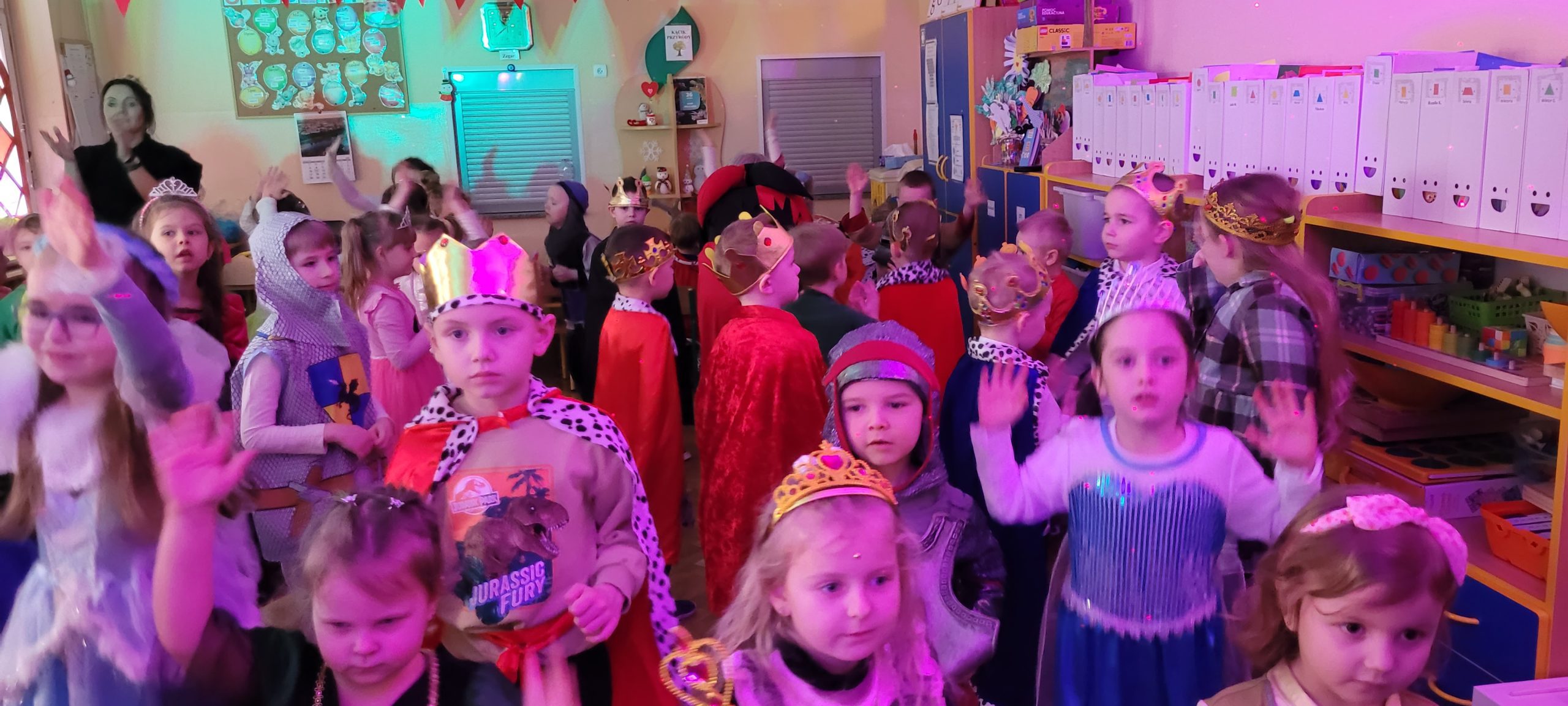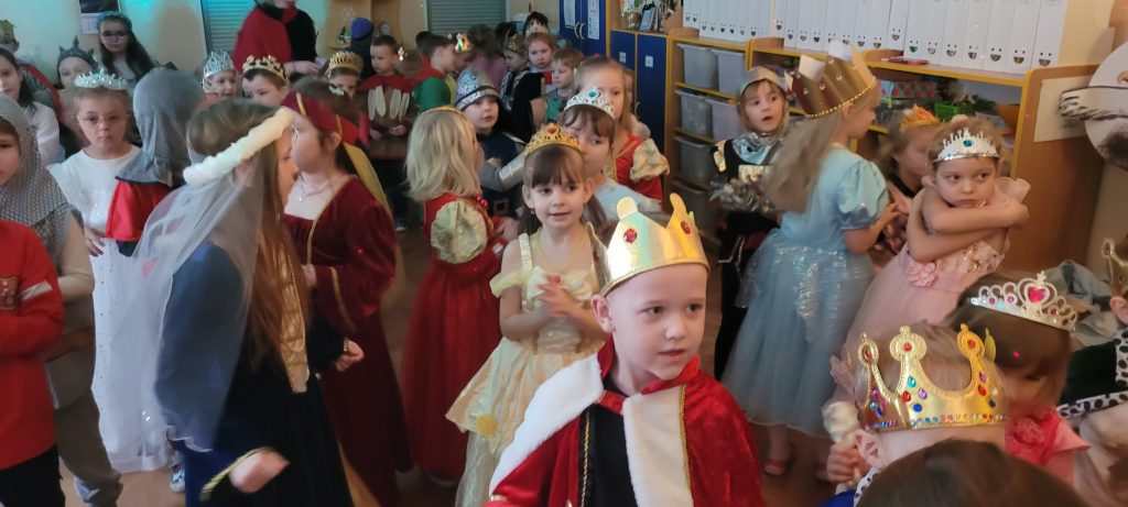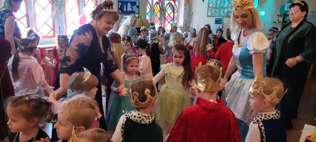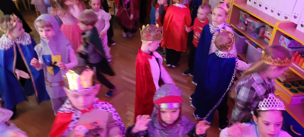 Dziś na królewskim balu było mnóstwo królów, królowych, królewien, księżniczek, książąt i rycerzy. Były też smoki, stańczyk i damy dworu. Do tańca przygrywał nam DJ, który świetnie zabawiał całe dworskie towarzystwo. Rozpoznać dzieci było bardzo trudno. Dzieci świetnie się bawiły uczestnicząc wspólnie ze swoimi paniami w tańcach oraz konkursach zręcznościowych i ruchowych. Muzyka porywała wszystkich do tańca w rytm samby, walczyka, „Kaczuch” i innych przebojów znanych dzieciom.