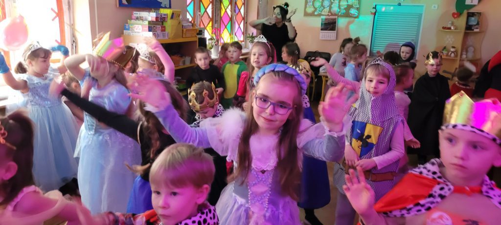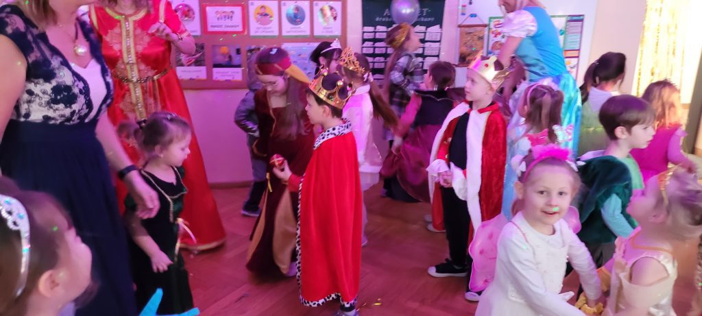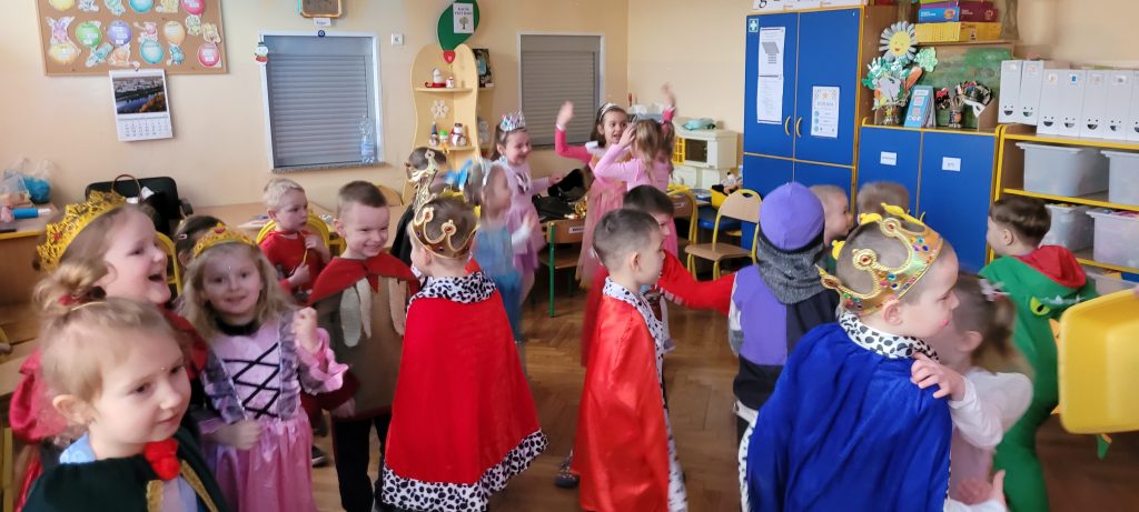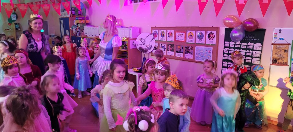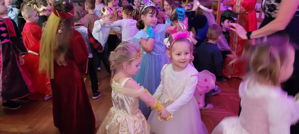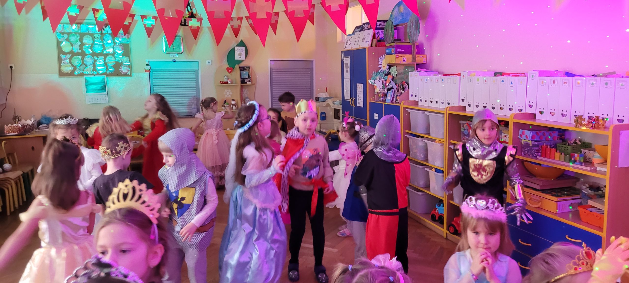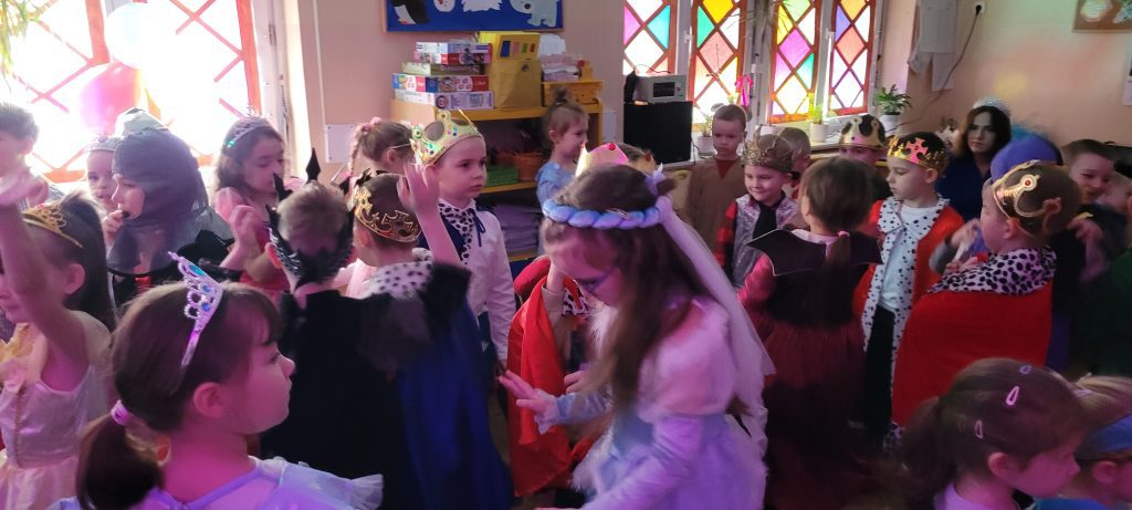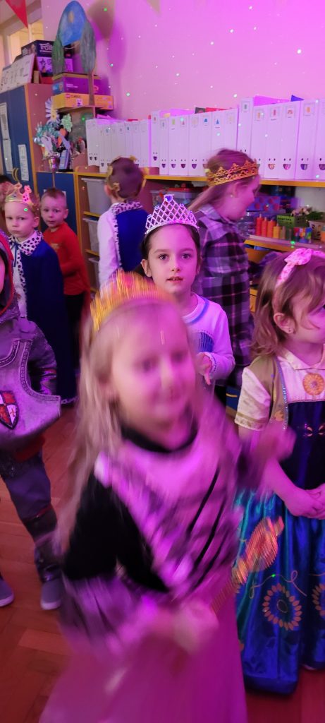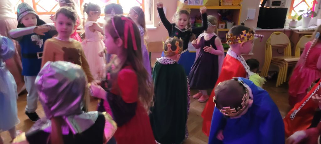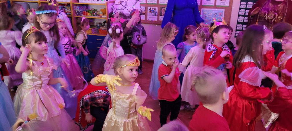 Dziś na królewskim balu było mnóstwo królów, królowych, królewien, księżniczek, książąt i rycerzy. Były też smoki, stańczyk i damy dworu. Do tańca przygrywał nam DJ, który świetnie zabawiał całe dworskie towarzystwo. Rozpoznać dzieci było bardzo trudno. Dzieci świetnie się bawiły uczestnicząc wspólnie ze swoimi paniami w tańcach oraz konkursach zręcznościowych i ruchowych. Muzyka porywała wszystkich do tańca w rytm samby, walczyka, „Kaczuch” i innych przebojów znanych dzieciom.