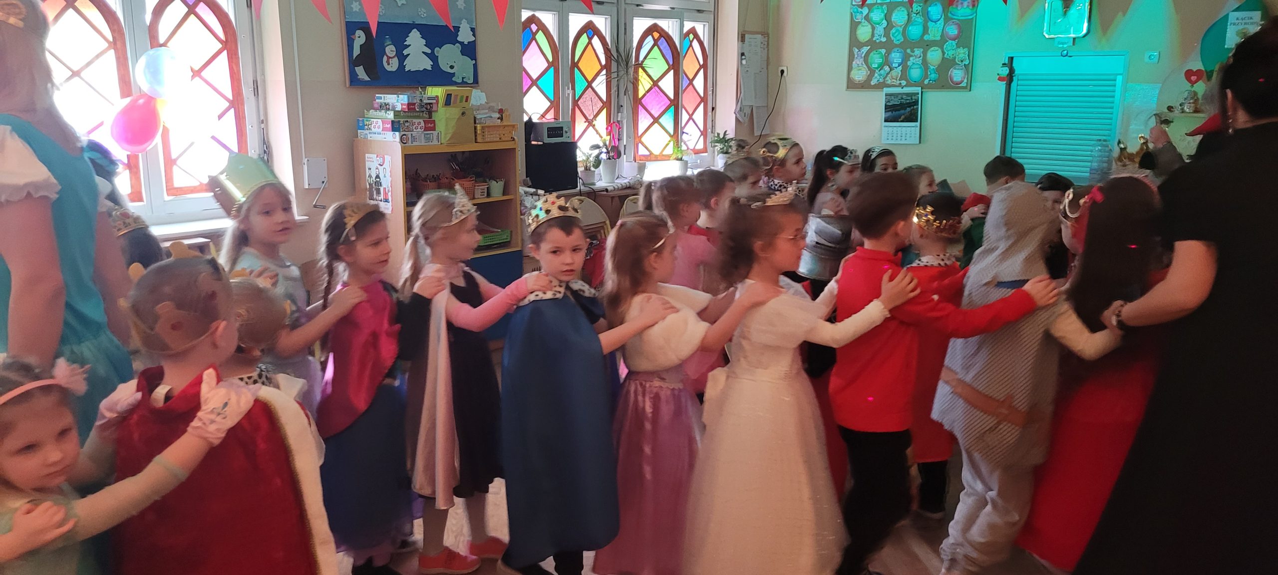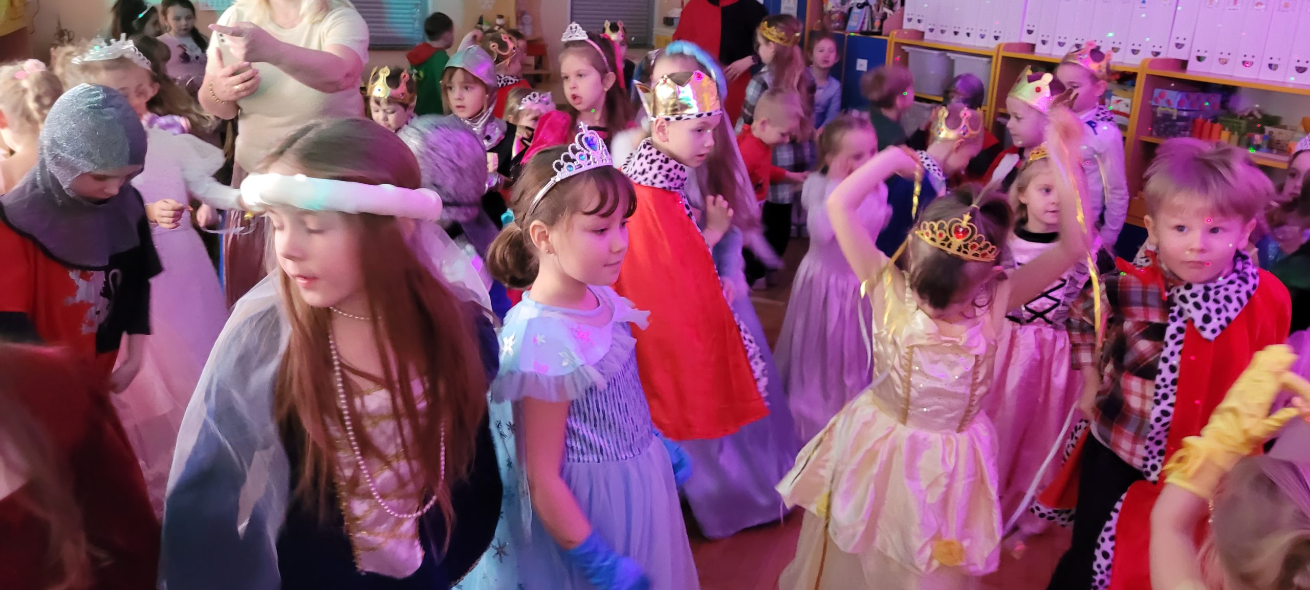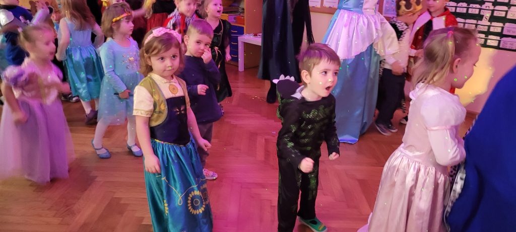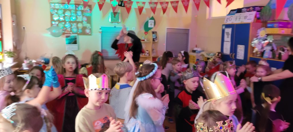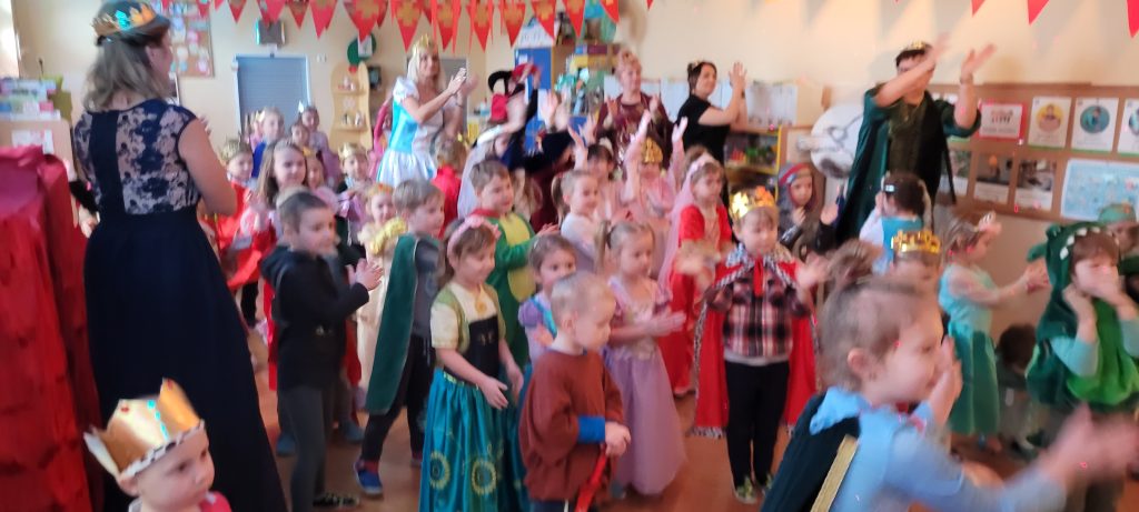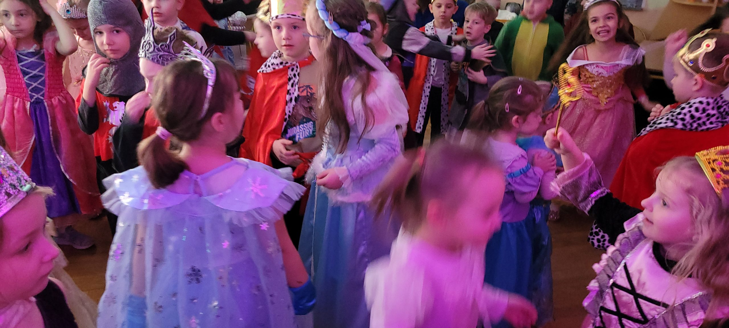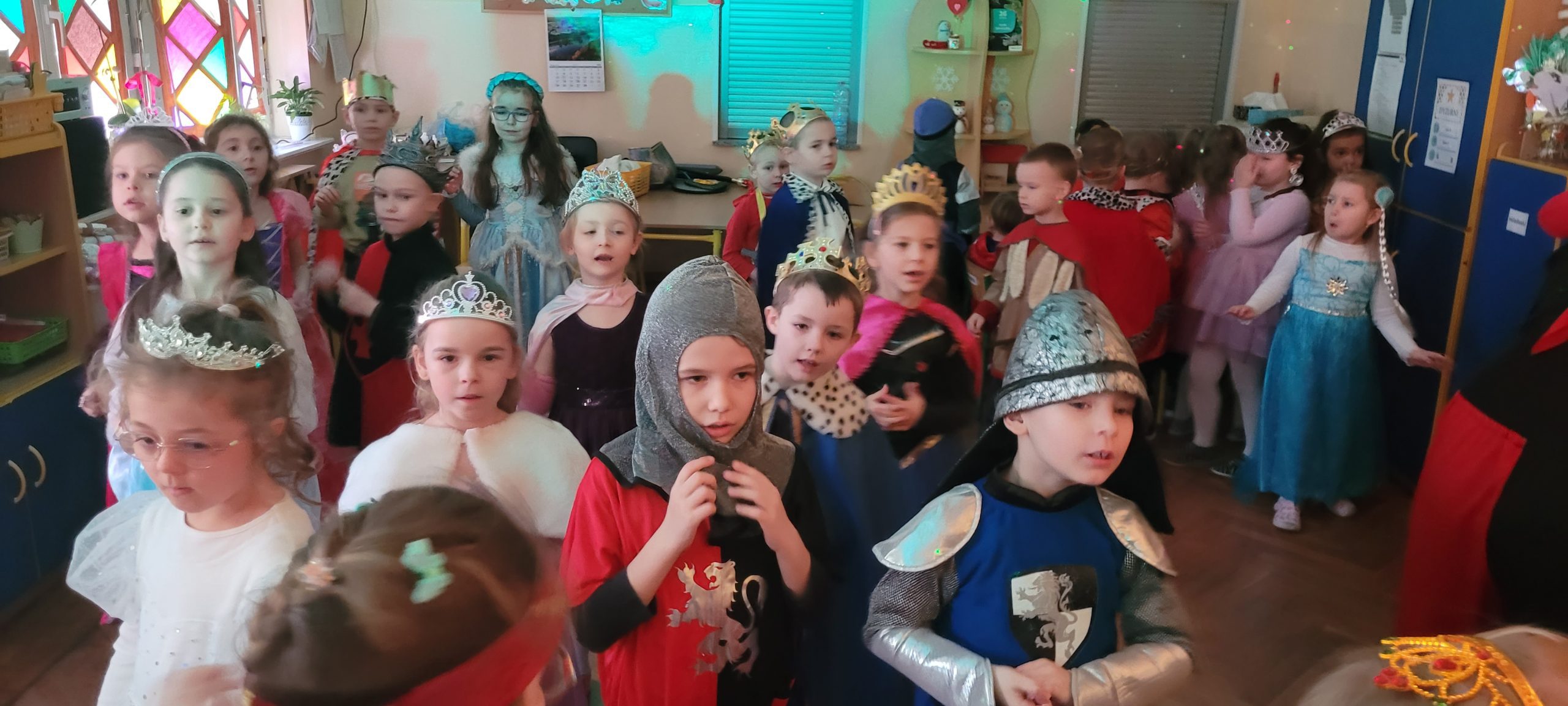 Dziś na królewskim balu było mnóstwo królów, królowych, królewien, księżniczek, książąt i rycerzy. Były też smoki, stańczyk i damy dworu. Do tańca przygrywał nam DJ, który świetnie zabawiał całe dworskie towarzystwo. Rozpoznać dzieci było bardzo trudno. Dzieci świetnie się bawiły uczestnicząc wspólnie ze swoimi paniami w tańcach oraz konkursach zręcznościowych i ruchowych. Muzyka porywała wszystkich do tańca w rytm samby, walczyka, „Kaczuch” i innych przebojów znanych dzieciom.