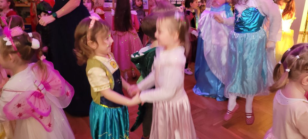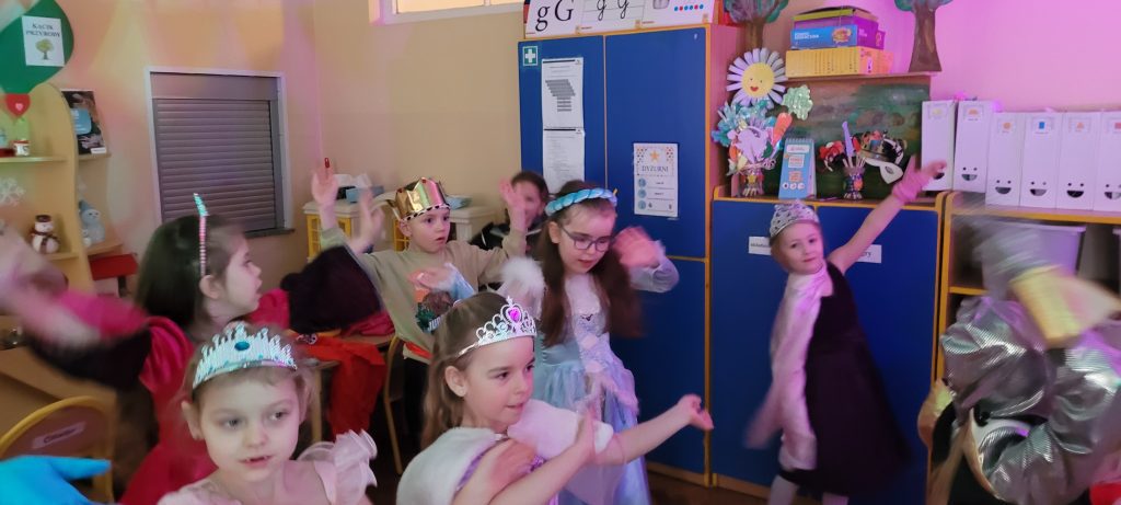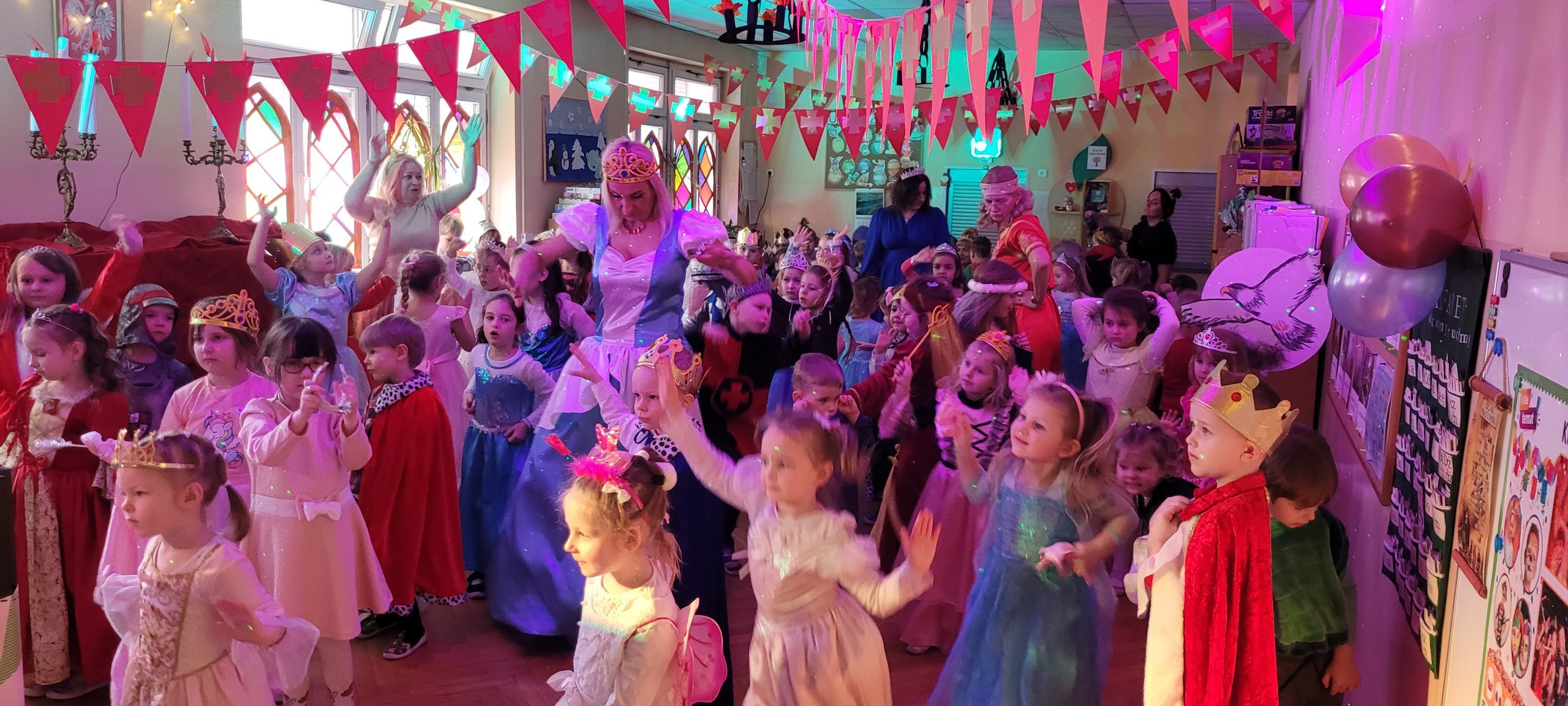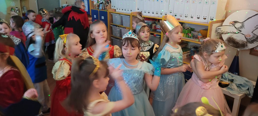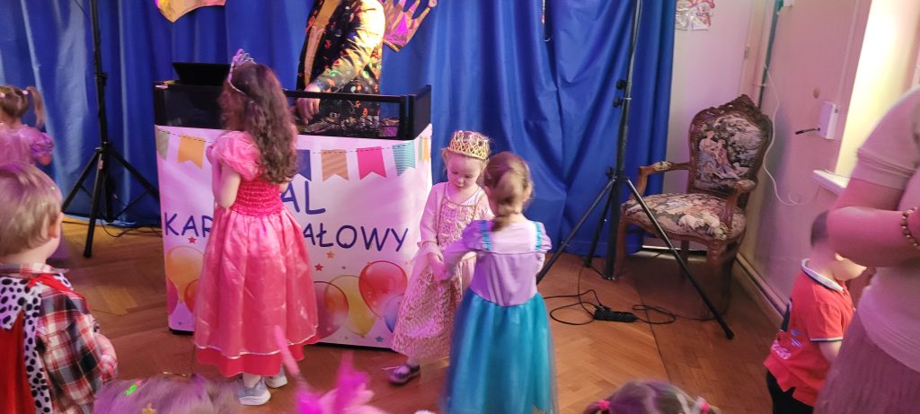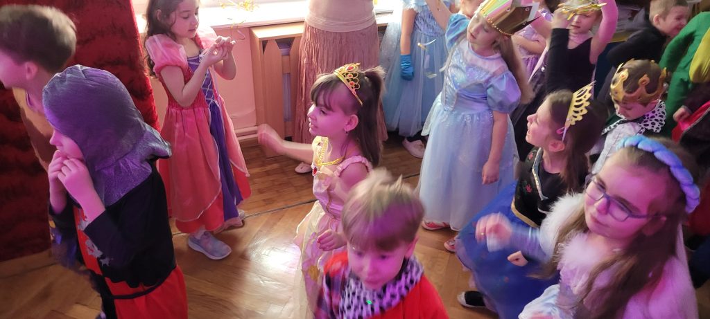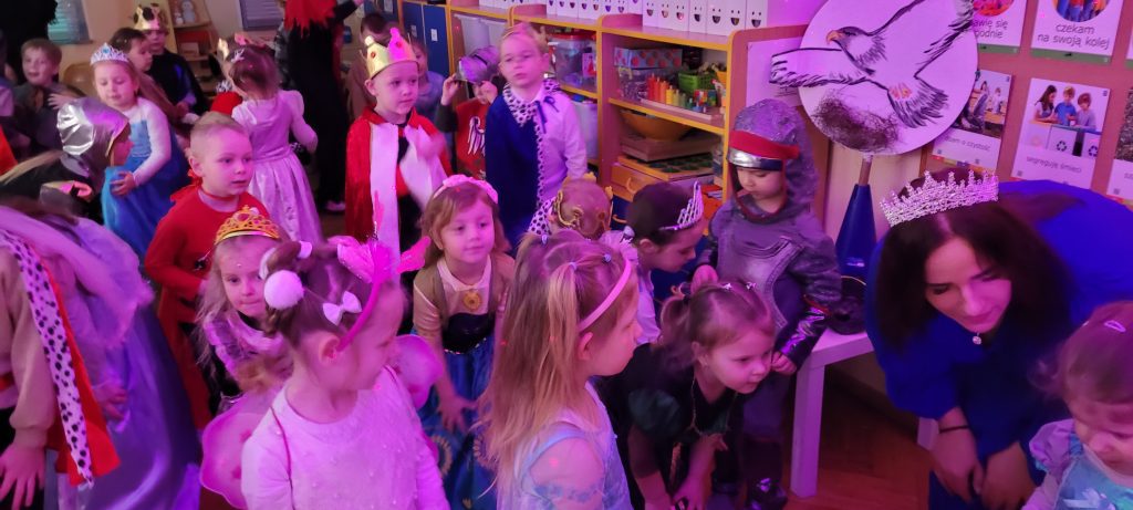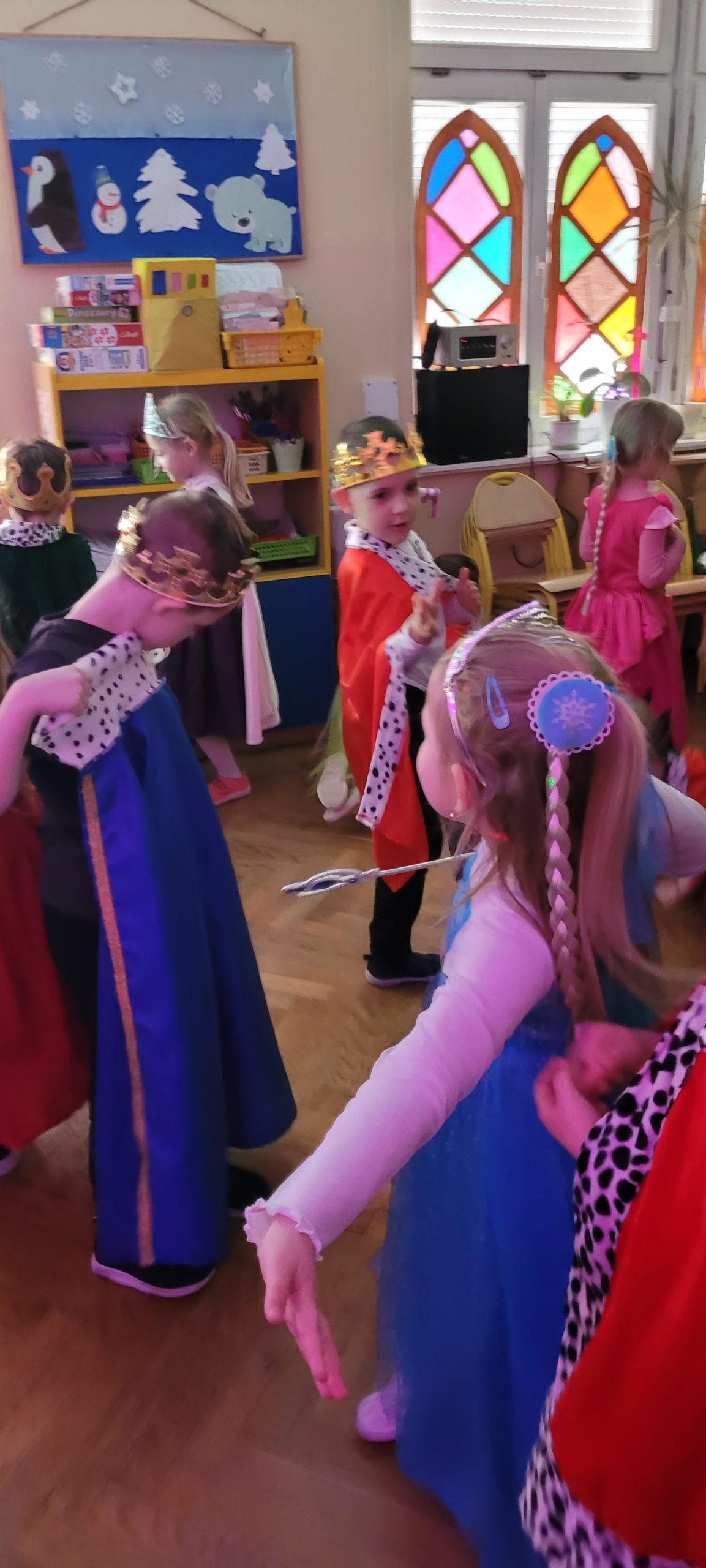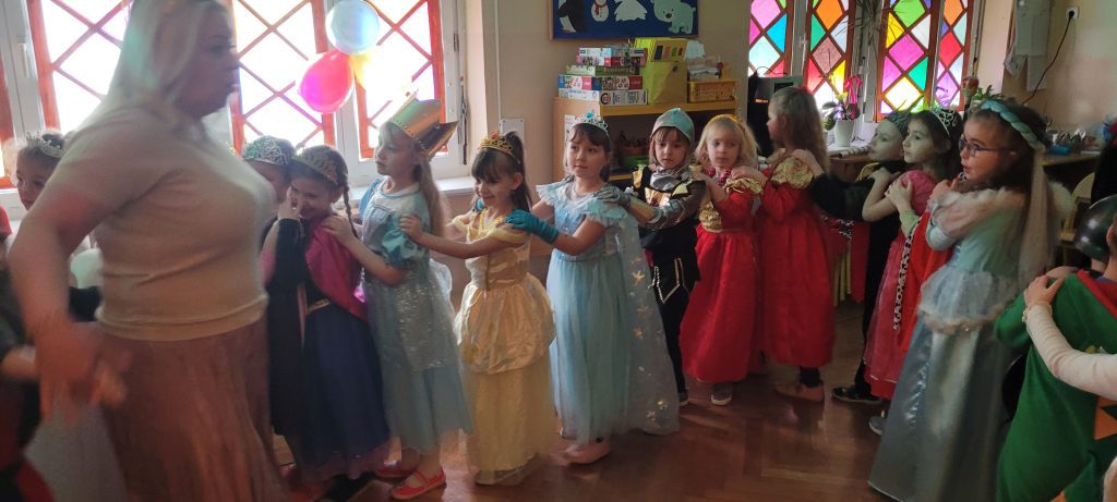 Dziś na królewskim balu było mnóstwo królów, królowych, królewien, księżniczek, książąt i rycerzy. Były też smoki, stańczyk i damy dworu. Do tańca przygrywał nam DJ, który świetnie zabawiał całe dworskie towarzystwo. Rozpoznać dzieci było bardzo trudno. Dzieci świetnie się bawiły uczestnicząc wspólnie ze swoimi paniami w tańcach oraz konkursach zręcznościowych i ruchowych. Muzyka porywała wszystkich do tańca w rytm samby, walczyka, „Kaczuch” i innych przebojów znanych dzieciom.