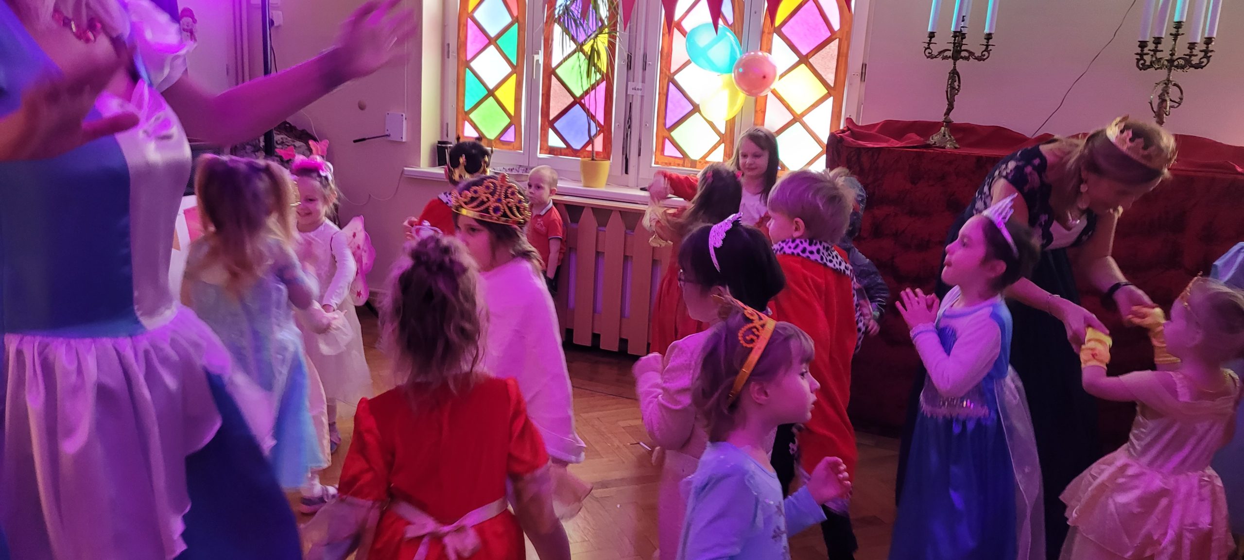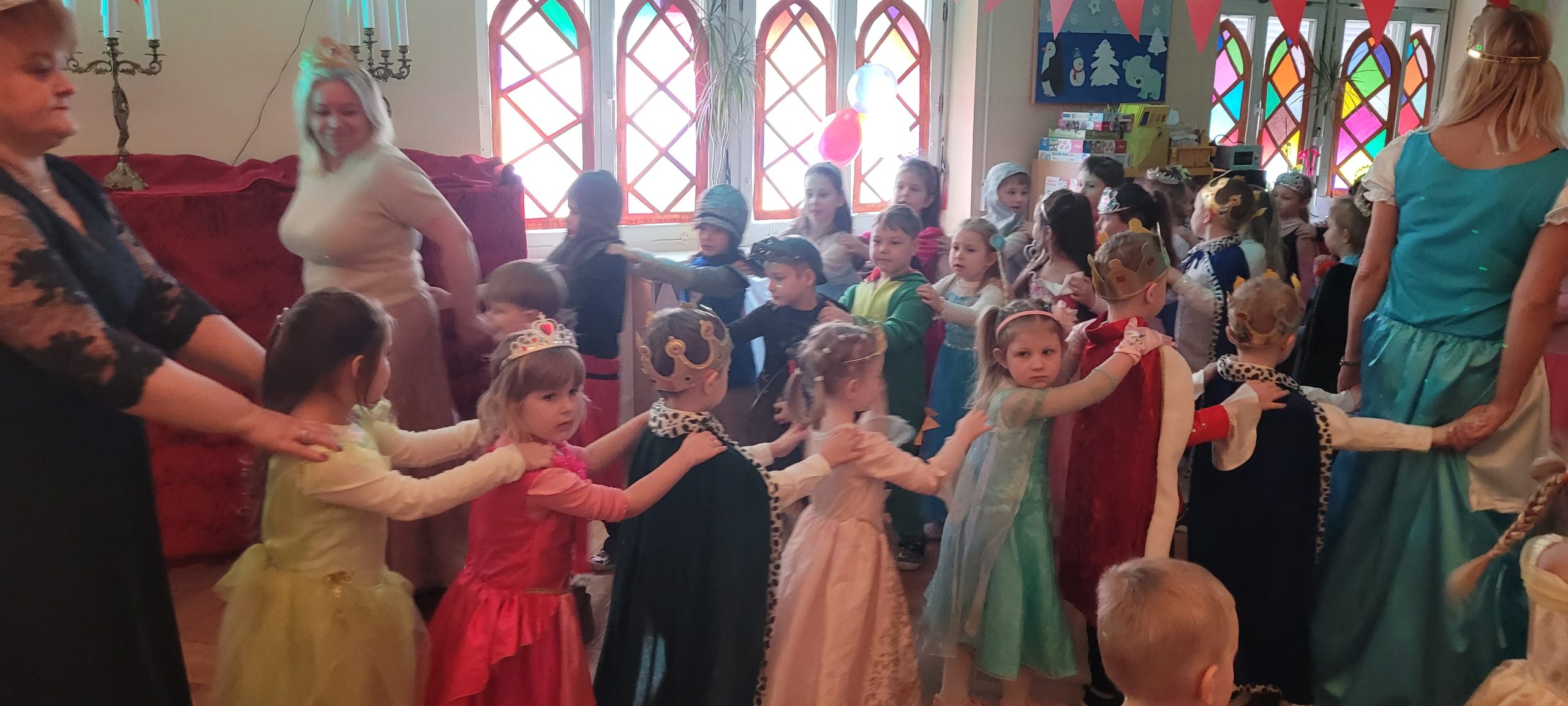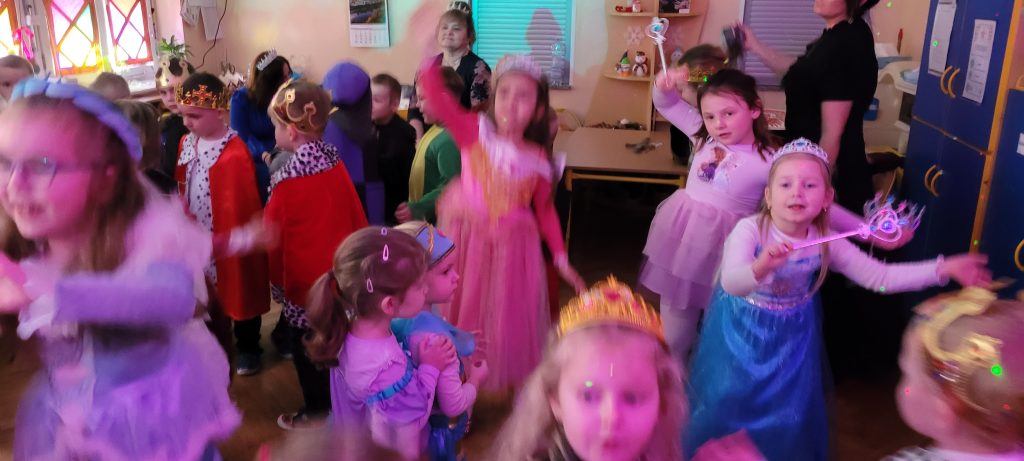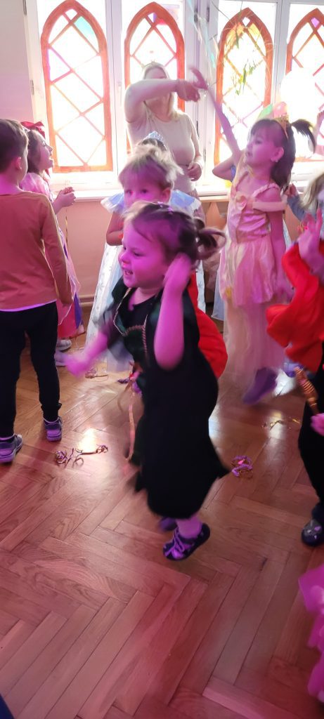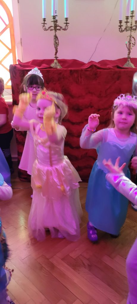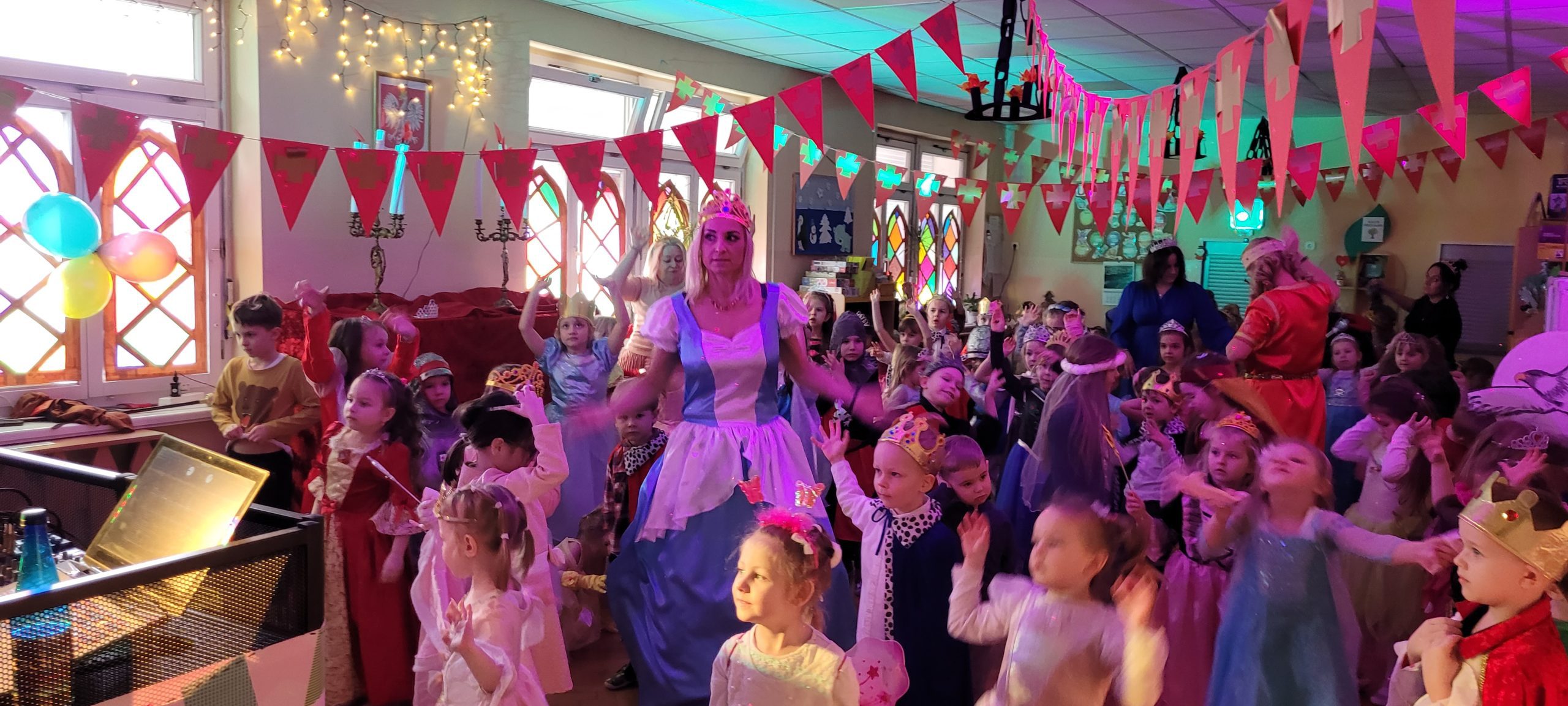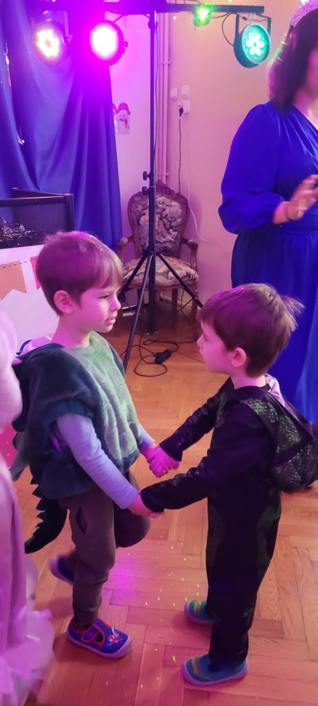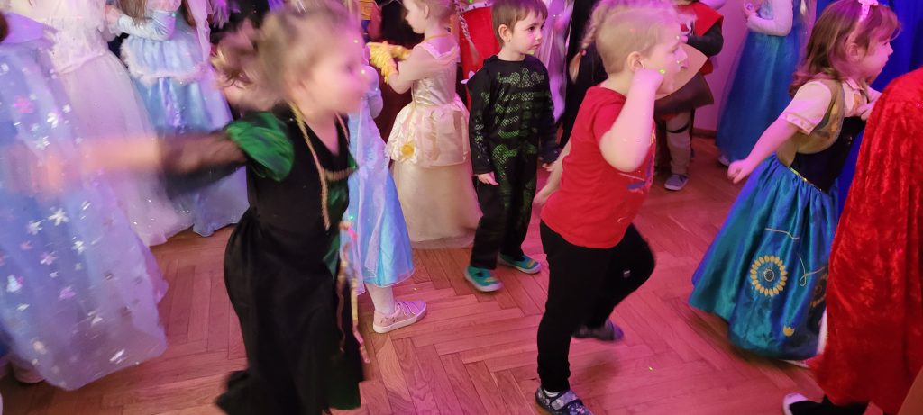 Dziś na królewskim balu było mnóstwo królów, królowych, królewien, księżniczek, książąt i rycerzy. Były też smoki, stańczyk i damy dworu. Do tańca przygrywał nam DJ, który świetnie zabawiał całe dworskie towarzystwo. Rozpoznać dzieci było bardzo trudno. Dzieci świetnie się bawiły uczestnicząc wspólnie ze swoimi paniami w tańcach oraz konkursach zręcznościowych i ruchowych. Muzyka porywała wszystkich do tańca w rytm samby, walczyka, „Kaczuch” i innych przebojów znanych dzieciom.