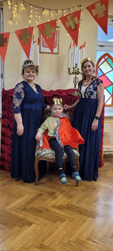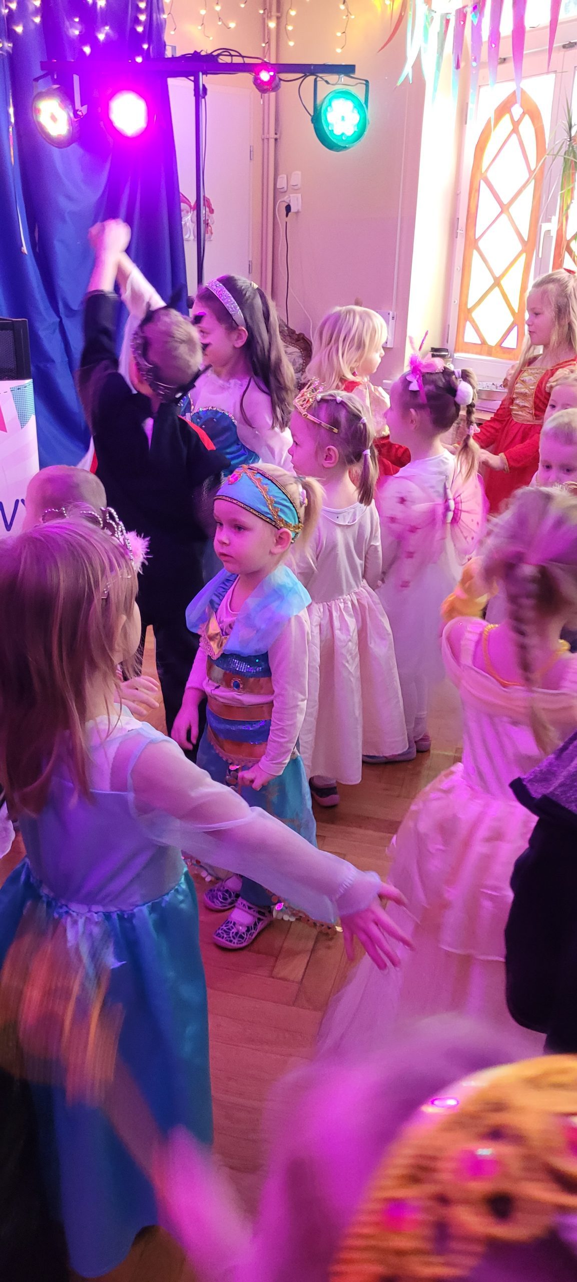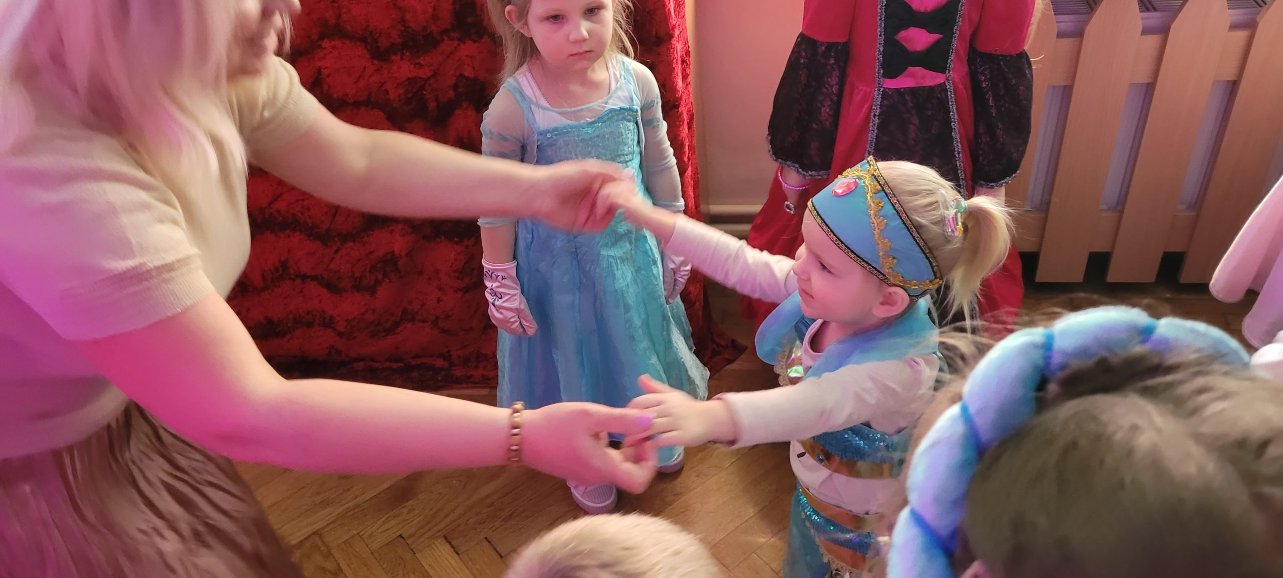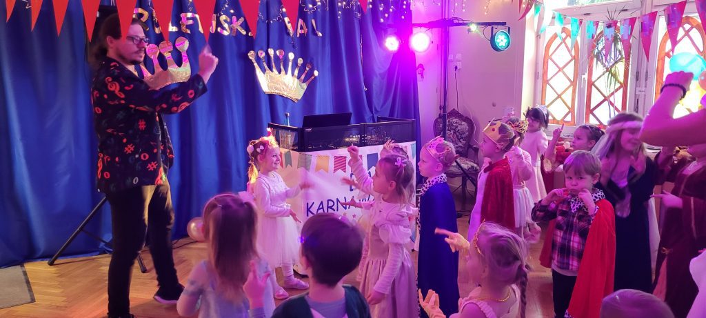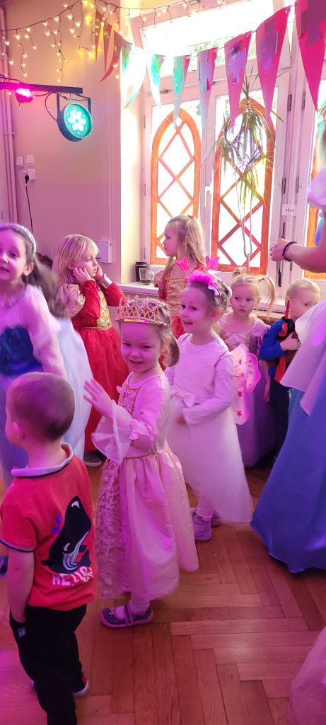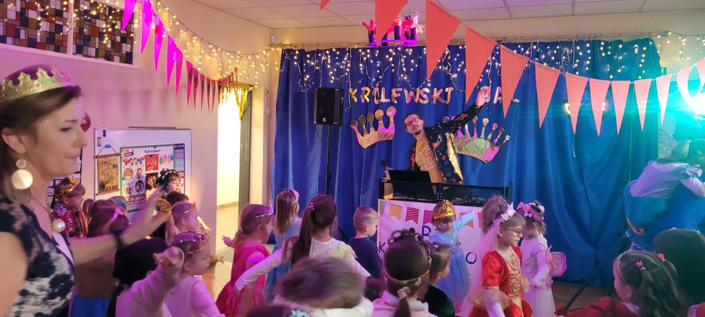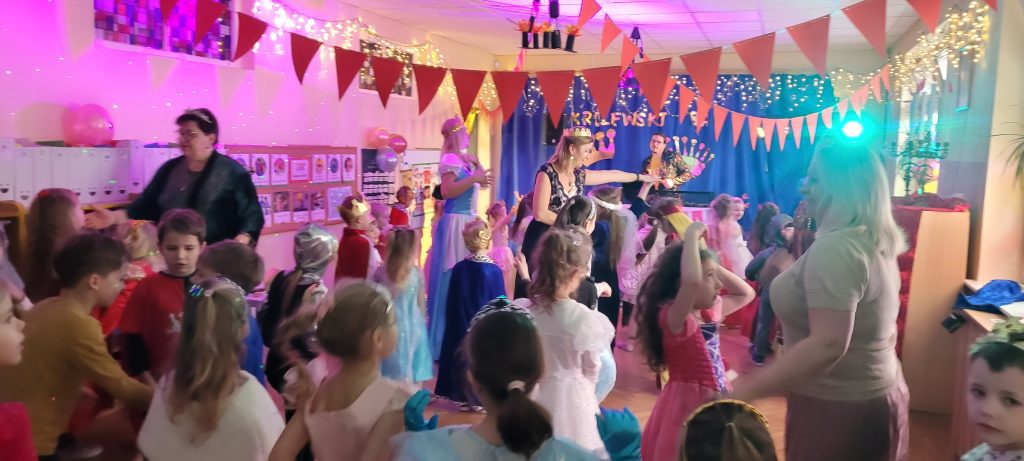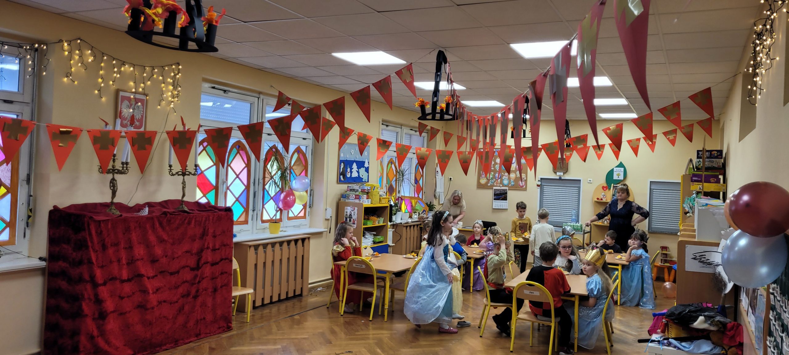 Dziś na królewskim balu było mnóstwo królów, królowych, królewien, księżniczek, książąt i rycerzy. Były też smoki, stańczyk i damy dworu. Do tańca przygrywał nam DJ, który świetnie zabawiał całe dworskie towarzystwo. Rozpoznać dzieci było bardzo trudno. Dzieci świetnie się bawiły uczestnicząc wspólnie ze swoimi paniami w tańcach oraz konkursach zręcznościowych i ruchowych. Muzyka porywała wszystkich do tańca w rytm samby, walczyka, „Kaczuch” i innych przebojów znanych dzieciom.