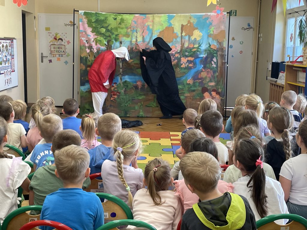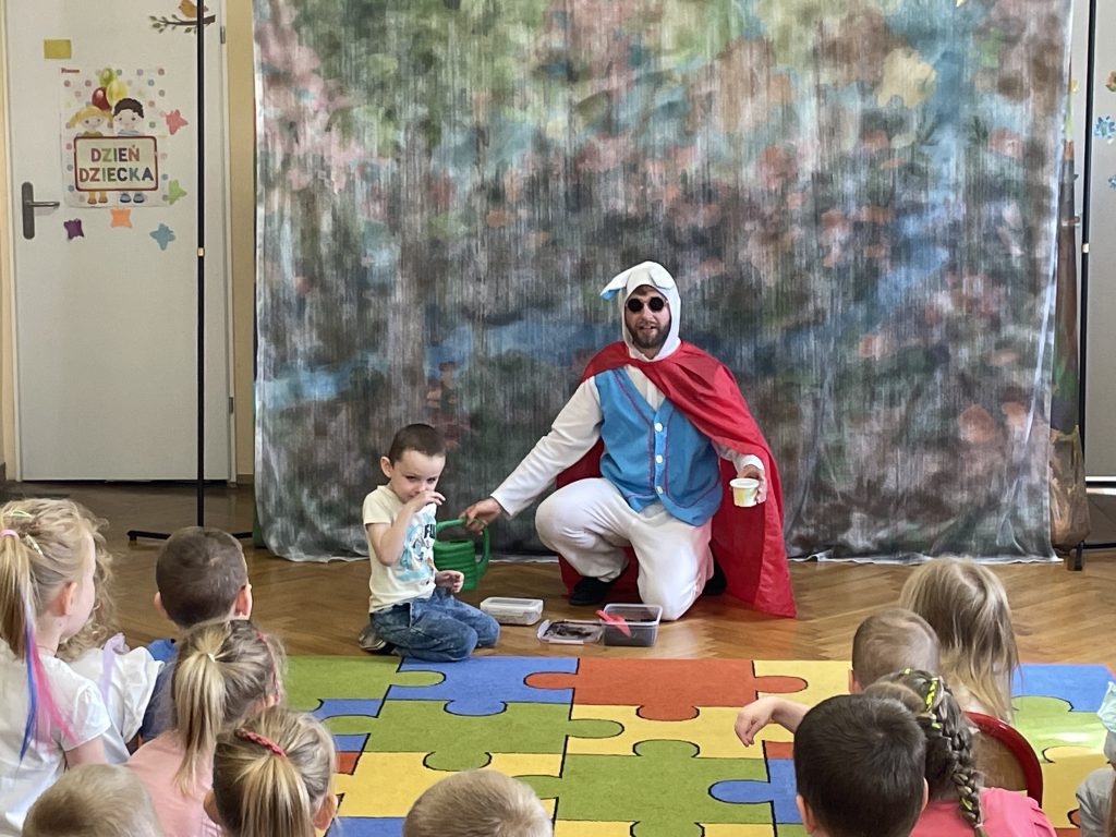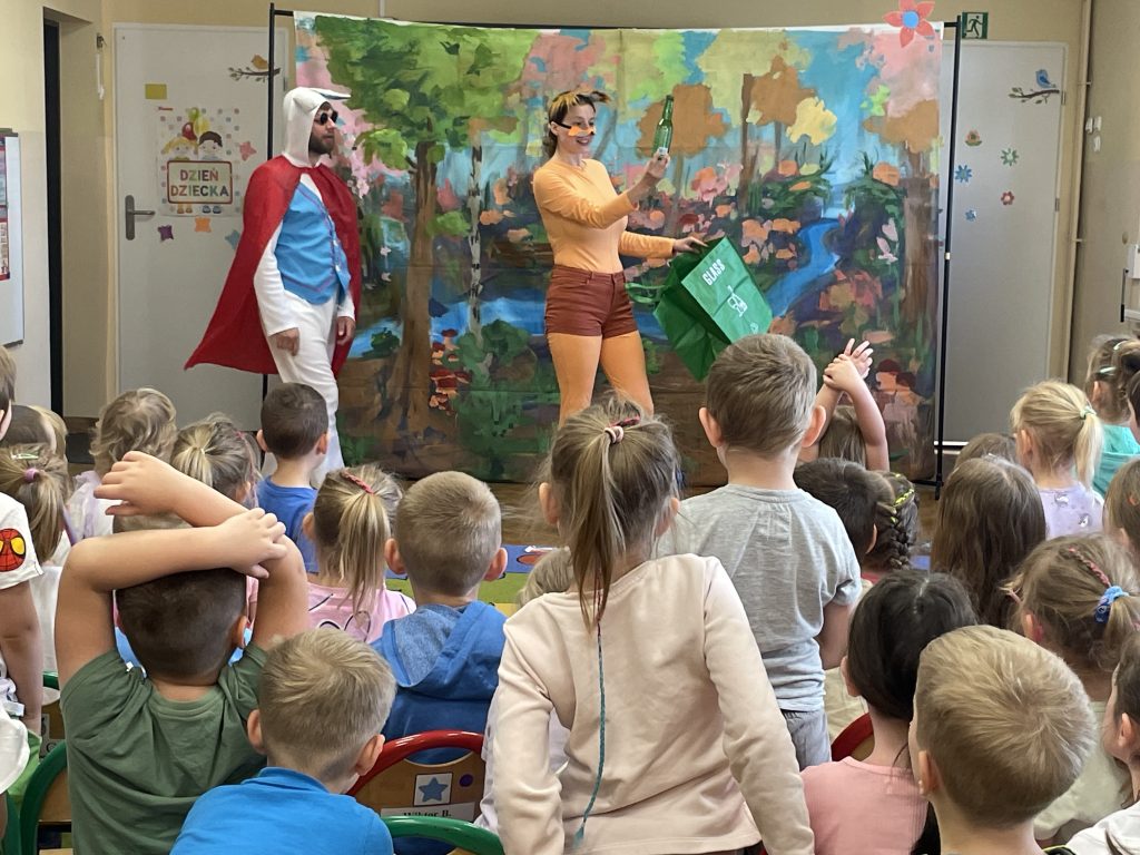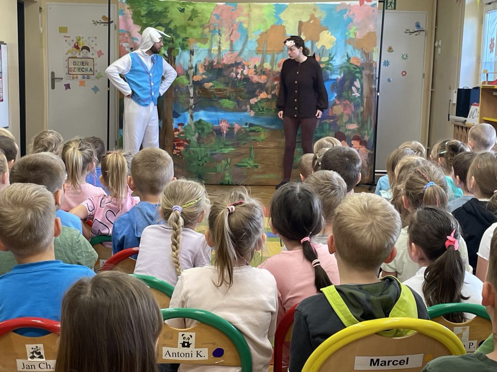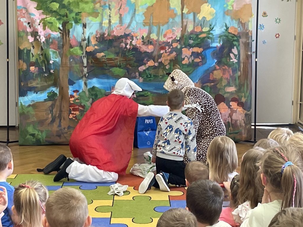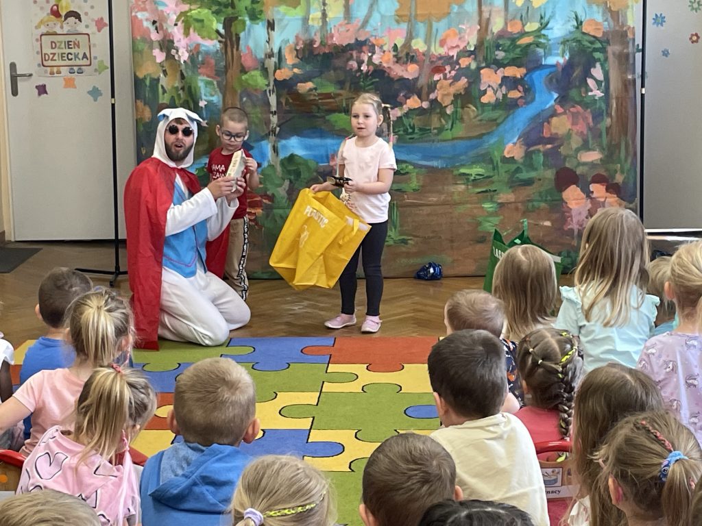 W czwartek 29.05. gościliśmy w przedszkolu teatrzyk ,,Złoty Melonik” z przedstawieniem pt. ,,Leśne EKOpowieści”. W Magicznym Lesie w zagadkowy sposób pojawiają się śmieci. Sprawą zająć się musi zarządca lasu – Zając Zenon, który będzie musiał pomóc zwierzakom uporać się z problemem. Podczas swojej przygody nauczy się segregować odpady, sadzić roślinki i walczyć ze smogiem. W pracy pomagają mu chętne przedszkolaki, które jednocześnie uczą się segregacji śmieci.