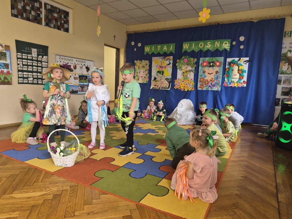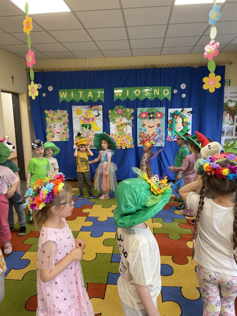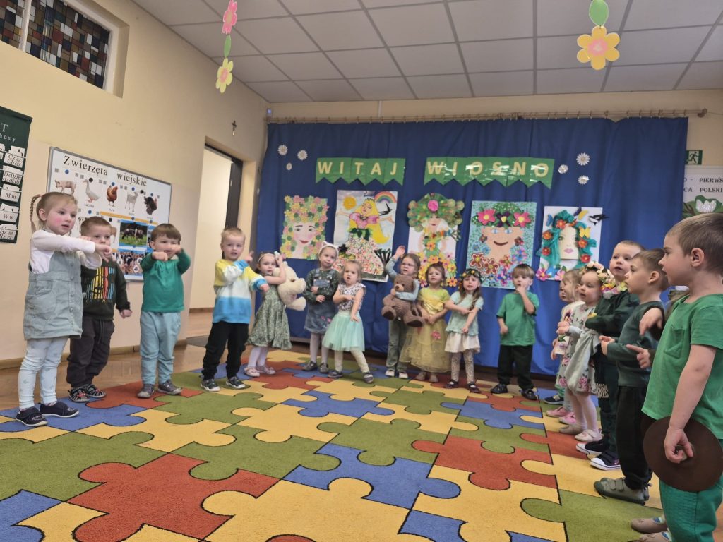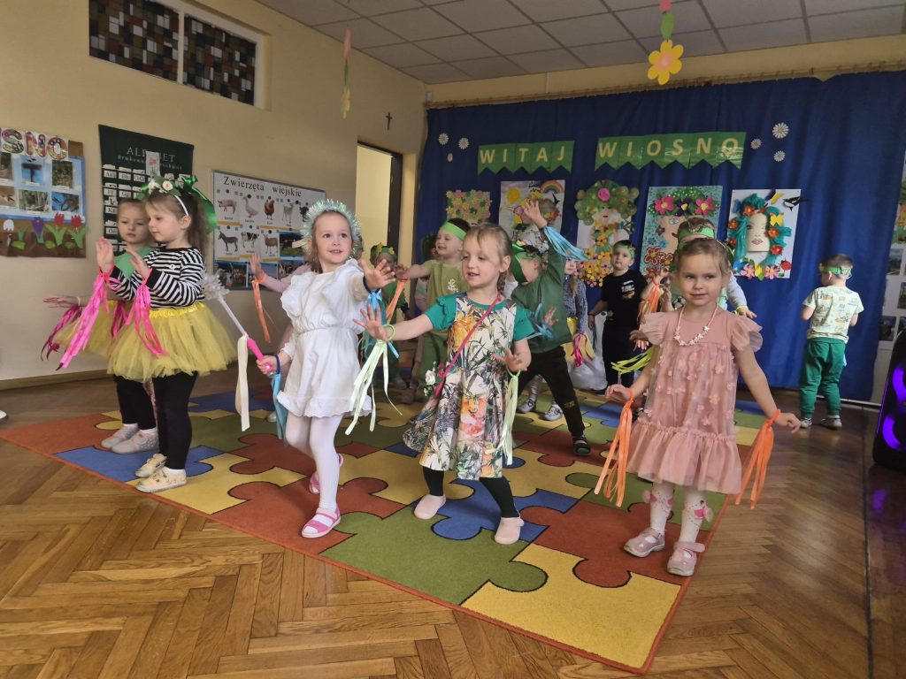 Powitanie wiosny w naszym przedszkolu odbyło się 20 marca od występu dzieci z grupy Stokrotek, które wierszykami i tańcem przywitały wyczekiwaną porę roku. Po odgadnięciu zagadek i zabawach sprawnościowych, przedszkolaki z każdej grupy zaprezentowały przygotowane piosenki, które wprowadziły wszystkich w radosny, wesoły nastrój. Następnie przemaszerowały wokół przedszkola w barwnym korowodzie z kwiatkami, balonami, palemkami skandując hasła o wiośnie. Mamy nadzieję, że wiosna zagości na dobre a wraz z nią ciepłe dni na które z utęsknieniem czekamy.