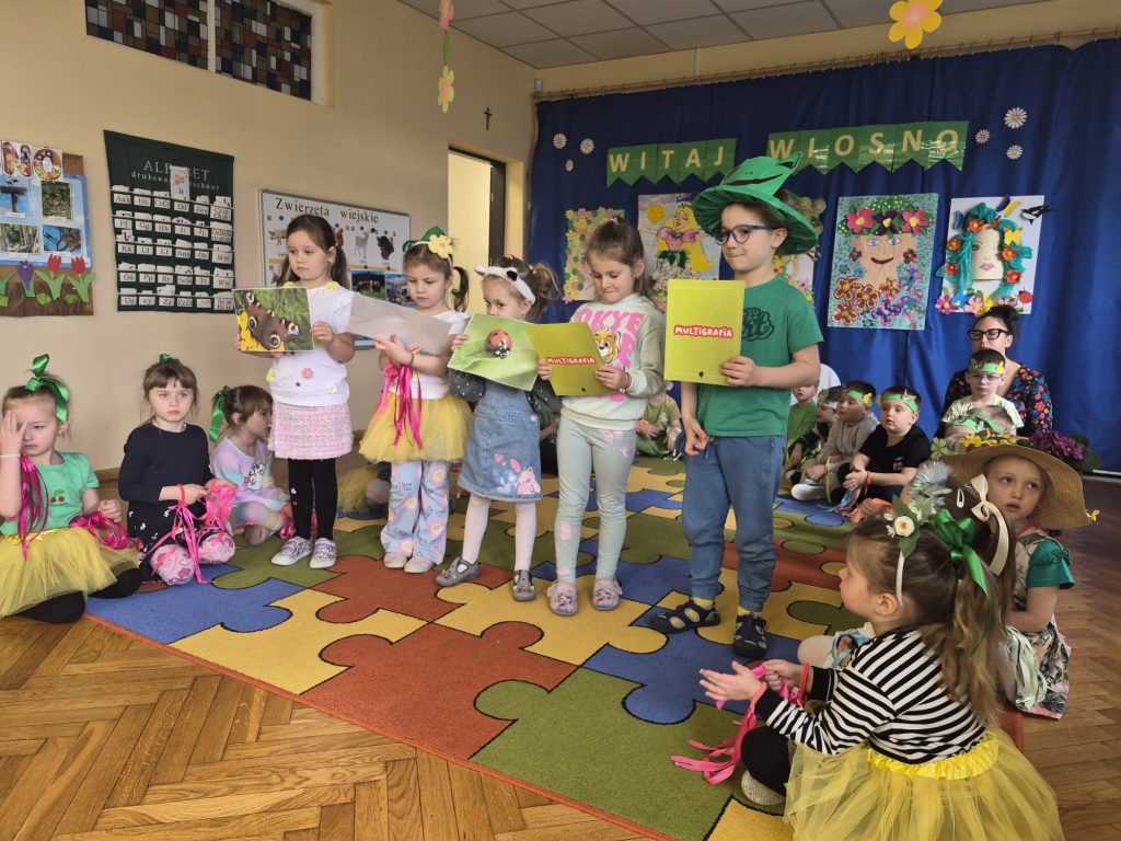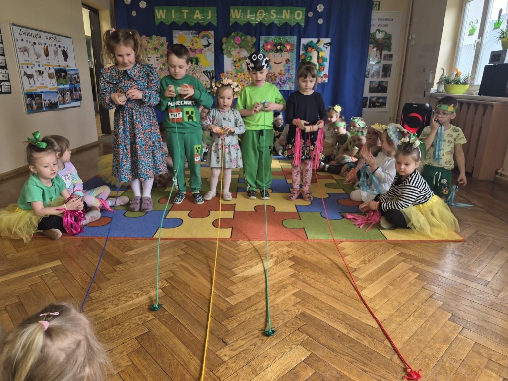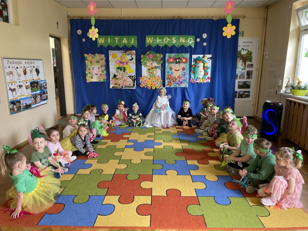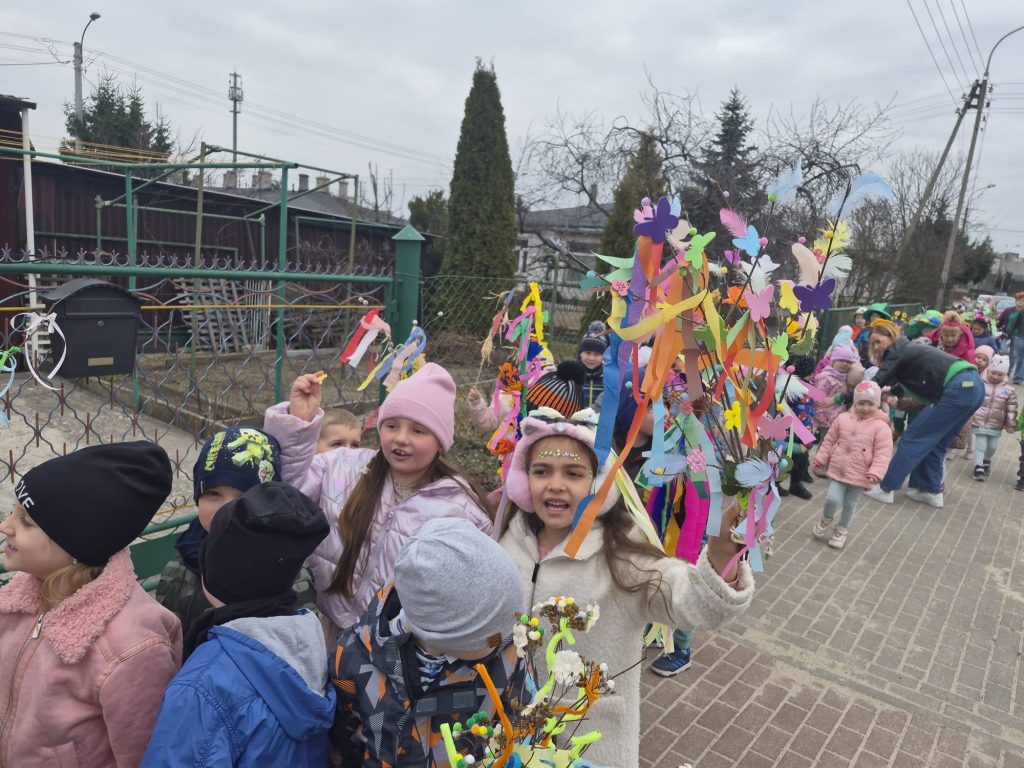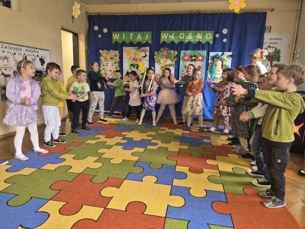 Powitanie wiosny w naszym przedszkolu odbyło się 20 marca od występu dzieci z grupy Stokrotek, które wierszykami i tańcem przywitały wyczekiwaną porę roku. Po odgadnięciu zagadek i zabawach sprawnościowych, przedszkolaki z każdej grupy zaprezentowały przygotowane piosenki, które wprowadziły wszystkich w radosny, wesoły nastrój. Następnie przemaszerowały wokół przedszkola w barwnym korowodzie z kwiatkami, balonami, palemkami skandując hasła o wiośnie. Mamy nadzieję, że wiosna zagości na dobre a wraz z nią ciepłe dni na które z utęsknieniem czekamy.