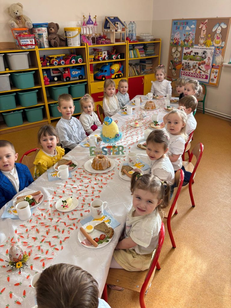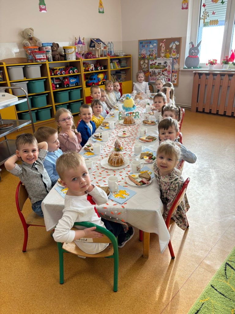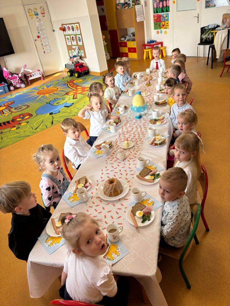 W naszej grupie odbyło się uroczyste Śniadanie Wielkanocne. Dzieci wspólnie zasiadły do pięknie udekorowanego stołu, poznając świąteczne tradycje i spędzając czas w radosnej atmosferze. Dodatkową atrakcją było poszukiwanie wielkanocnych koszyczków, które sprawiło dzieciom wiele radości i wywołało mnóstwo uśmiechów.